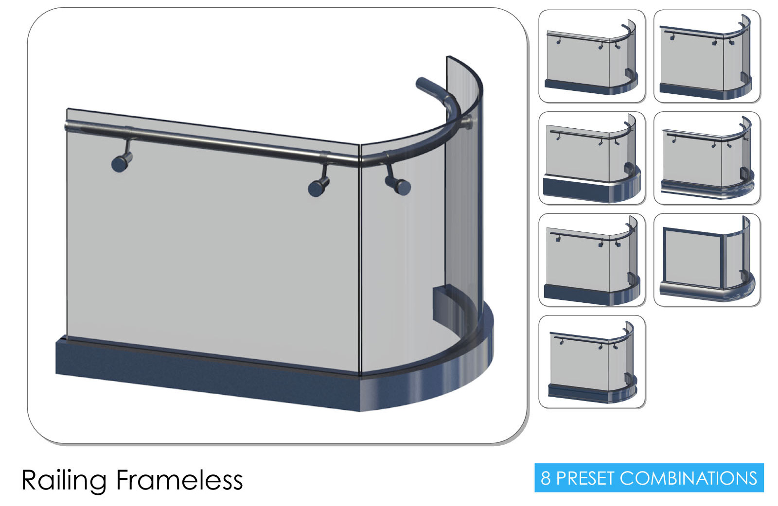 3DMD Railings are archicad object tools. You can simple draw a 3d polyline both 2d and 3d window. You can create curved and sloped path. There are many parameters for post, panel, cable, handrail; you can create you own rail. An option for list allow you to have the railing straightened in the schedule also with quantities for each elements of the railing. You can quickly manage in 2d/3d windows the position and visibility of posts and cables/panels.
