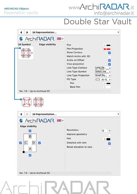 ALERT - LIMITS OF USE: This object is editable and adjustable from the ARCHICAD 19 version up to the current version at the time of purchase. When a new version of ARCHICAD is released and you decide to switch to it, you will need to download the paid update of the vault from the ArchiRADAR shop at a reduced cost; you will be able to use a discount code received at the time of purchase. If you do not proceed with the update, the object can be viewed and used for the documents but it will no longer be editable and adjustable.