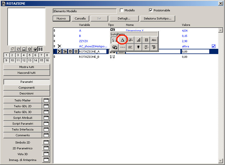 Adesso clicchiamo sulla finestra bianca accanto il tasto“Testo GDL 3D”  che ci farà apparire la finestra con le righe di comando