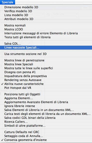 Il Menu Speciale è un menu nascosto, contenente una serie di comandi utili per la gestione degli oggetti di libreria, per una diversa o migliore visualizzazione tridimensionale degli elementi da costruzione di ArchiCAD, ma alcuni ad appannaggio esclusivo degli sviluppatori Graphisoft o di Add-on di terze parti.