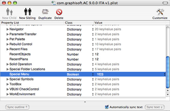 Una volta installato il programma, è sufficiente fare un "drag and drop" del file plist di ArchiCAD sull'icona dell'applicazione per aprirlo. All'interno della finestra che si aprirà, scorrere il listato fino alla voce Special Menu ed impostare la Classe Boolean sul valore YES.