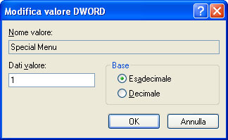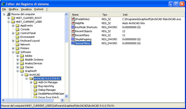 Selezionare quindi la cartella HKEY_CURRENT_USER/Software/Graphisoft/ArchiCAD/ArchiCAD 9 ITA R1 e fare un clic tenendo premuto il tasto destro del mouse sulla chiave Special Menu. Assegnare il valore 1 e confermare cliccando sul pulsante OK.