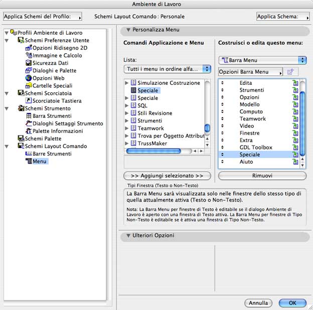 Una volta aperto ArchiCAD, selezionare dal menu Opzioni il comando Ambiente di Lavoro. Nella schermata che si apre, selezionare (a sinistra, sotto Schemi Layout Comando) la voce Menu. Dopodichè scorrere, nella finestra di destra, "Tutti i menu per Tema" fino a quando non si visualizza la voce Speciale. Selezionarlo e aggiungerlo nella Barra menu cliccando sul tasto 'Aggiungi selezionato'. Premere infine il pulsante OK per confermare le impostazioni e chiudere la finestra Ambiente di Lavoro.