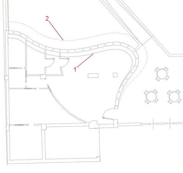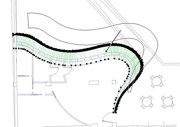 La linea di attacco a terra del muro (1) e la linea tratteggiata (2) di proiezione del coronamento del nostro muro curvo distano di circa 1,50 metri e man mano che ci si avvicina alla porta d’ingresso convergono facendo diminuire l’inclinazione del muro.