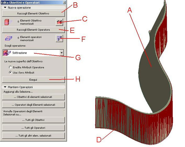 Utilizziamo adesso gli operatori booleani: andiamo nella finestra 3d e poi sul menu "edita-operazioni con gli elementi solidi..." selezioniamo la "mesh -muro" (A) poi "raccogli elementi obbiettivo" (B)e dunque raggruppate gli elementi (C), adesso selezionare la "mesh booleana" (D), poi "raccogli elementi operatore" (E) e dunque raggruppate gli elementi (F).