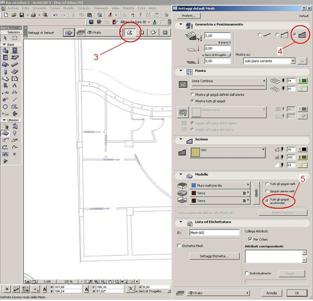 Selezioniamo lo strumento mesh e nella modalità "Metodo Geometria Mesh" (3) e nella finestra dei settaggi dobbiamo spuntare l'opzione per creare corpi solidi con la mesh (4) e la modalità "tutti gli spigoli arrotondati" (5)
