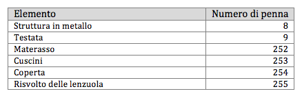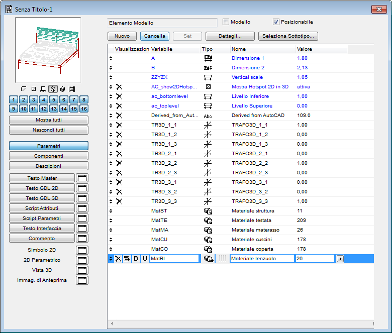 Per semplificare l'operazione successiva, è importante che ogni variabile sia identificata in maniera mnemonica, per questo indichiamo con MatST il parametro del materiale della struttura, MatTE quello della testata, MatMA per il materasso, MatCU per i cuscini, ecc.