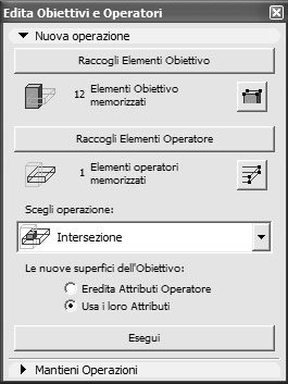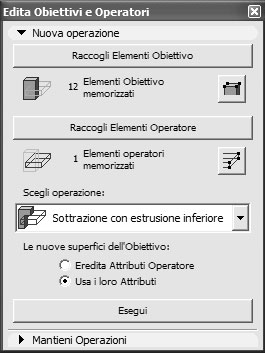 9.Ancora una Operazione con gli Elementi Solidi: impostate sempre i muri come Obiettivo e il terreno (questa volta l'originale e non la copia) come Operatore. L'operazione da eseguire è una sottrazione con estrusione inferiore. La parte inferiore dei muri verrà eliminata, con un andamento parallelo al corrispondente taglio superiore.