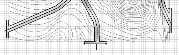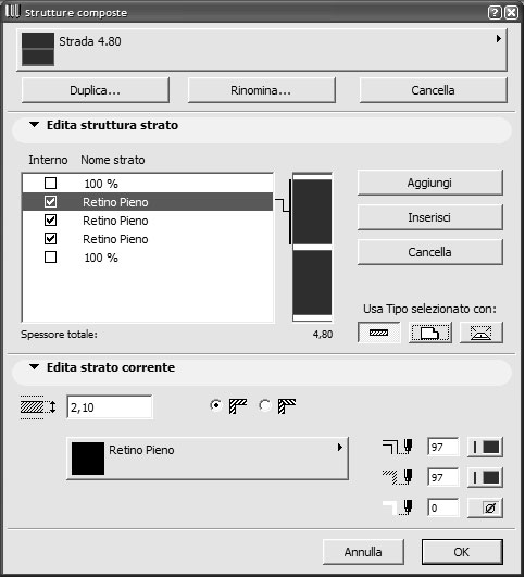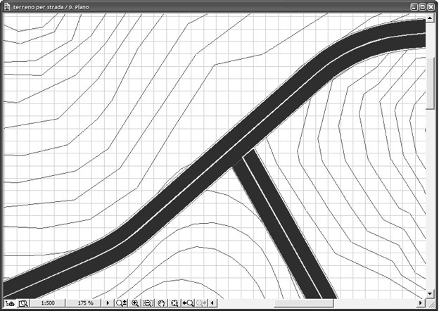 Resta da dire che, ovviamente, si tratta solo di elementi che aiutano a rappresentare il progetto, non si tratta di una vera strada. I nostri muri seguono semplicemente l'andamento del terreno, mentre una strada dovrebbe avere, come minimo, una sezione trasversale sempre orizzontale ... ma per gli usi normali, può essere sufficiente. Altrimenti sarà meglio procurarsi un idoneo Add-on, ad esempio ArchiTerra 2 (vedi sezione add-on di questo sito) Possiamo ancora dire che l'aspetto grafico del 2D può essere migliorato, realizzando un muro composto di tipo adeguato (Opzioni/Strutture composte). In questo modo si può avere la divisione in carreggiate ed eventualmente in corsie, marciapiedi, ecc. L'utilizzo del muro, per creare la strada, permette di ottenere in modo molto semplice un elemento di larghezza costante. La legatura automatica dei muri facilita inoltre la realizzazione di intersezioni stradali, mentre eventuali raccordi, piazzole, o altre situazioni speciali possono essere risolte con il Muro Poligonale. In quest'ultimo caso, però, non si potrà usare la struttura composta, e sarà necessario ritoccare l'aspetto grafico utilizzando linee e retini.