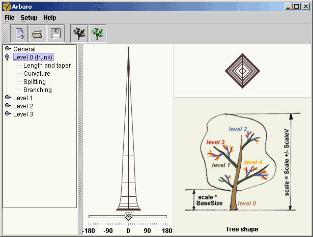 Dopo l'installazione, molto semplice, cominciamo ad analizzare l'interfaccia di Arbaro. L'immagine in basso a destra ci mostra i 5 livelli di dettaglio della tree shape (forma dell'albero), partendo dal livello 0-trunk (il tronco) per arrivare fino al livello 4 (forma e distribuzione delle foglie) passando per le ramificazioni intermedie.