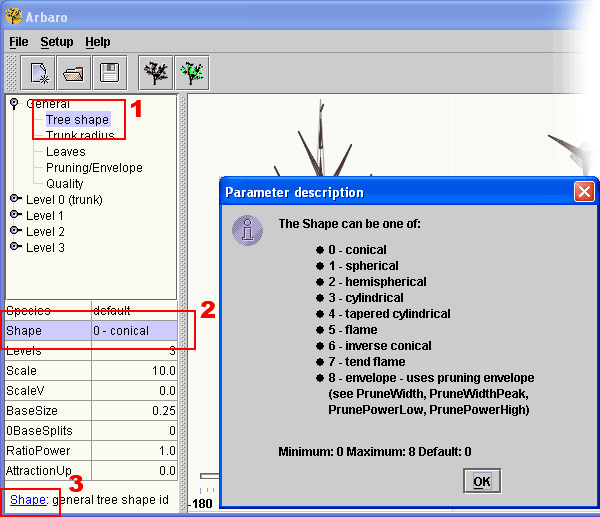 In alto a sinistra si trova un menu a tendina che permette di accedere a tutti i settaggi. Un click sul puntatore a sinistra di "General" (settaggi generali) e si apre il sottomenu relativo contenente le voci Tree shape (forma del tronco), Trunk radius (raggio del tronco), Leaves (foglie), Pruning/Envelope (potatura/sviluppo) e Quality (qualità/risoluzione). Ognuna di queste voci apre una diversa sezione di settaggi in basso a sinistra. Ogni parametro è spiegato tramite il link in basso. A titolo di esempio la voce Shape (forma dell'albero) in basso ha la sua descrizione Shape: general tree shape id (Forma: identificativo generale della forma dell'albero), cliccando sempre in basso su Shape si apre la finestra di aiuto con una descrizione più dettagliata.