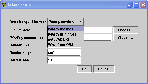 Per non dover ogni volta specificare una cartella e il formato (Povray, DXF o OBJ) di esportazione attraverso il menu Setup possiamo invece ridefinire i valori di default per: formato, cartella di salvataggio, percorso dell'eseguibile di Povray con le misure in pixel del rendering risultante e valore di seed. Una piccola nota su quest'ultimo parametro; il valore di seed (seme) identifica il numero di partenza per la generazione pseudo-casuale di una sequenza di numeri, in parole povere cambiando questo valore ogni albero sarà geometricamente diverso nella forma (nella realtà non esisteranno mai due alberi perfettamente identici).