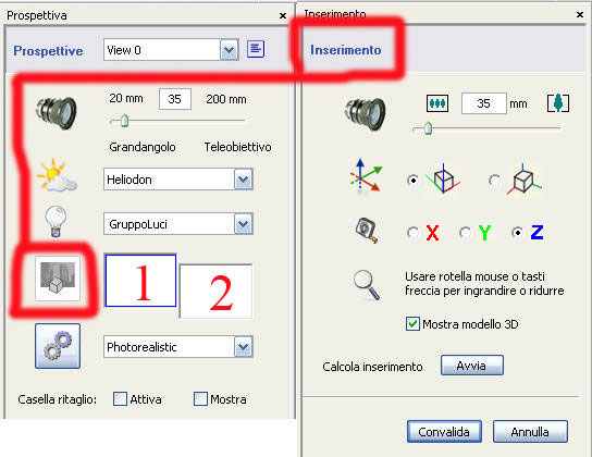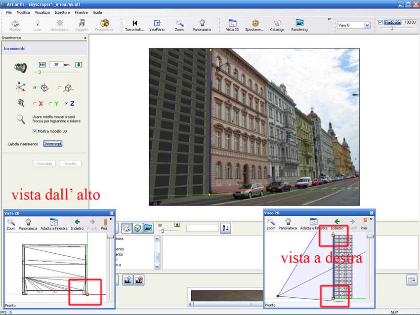 A questo punto avviamo il calcolo automatico dell'inserimento cliccando sul relativo pulsante. Il modello si posizionerà così alle coordinate assegnate in precedenza. È probabile che incontriate difficoltà, ai primi tentativi, nel riuscire a trovare le giuste linee di fuga. Se il modello dopo qualche secondo dovesse continuare a roteare , è stato sicuramente fatto un errore con le linee di fuga.