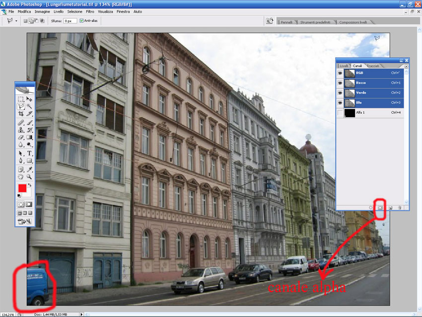 Una volta creata la selezione nella lista Canali, clicchiamo il pulsante nel riquadro rosso. Abbiamo così creato un Canale Alpha.