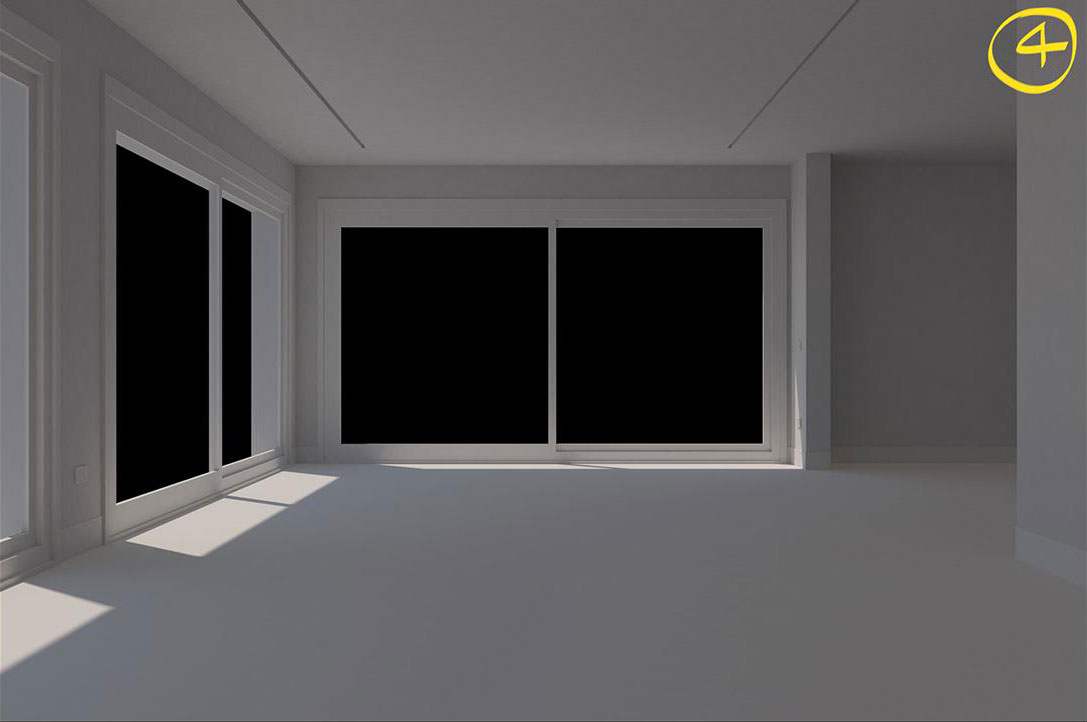 Notate come, dall'immagine 1 all'immagine 4, il render via via arriva ad essere più pulito. Ovviamente i tempi di render aumentano ma non di molto. Però non abbiamo ancora abbastanza luce e la scena è ancora vuota.