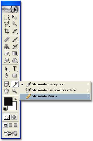 Nel caso più fortunato, sarà necessario solo ruotare l'immagine, ed è il caso che si presenta, per esempio, se si fa una scansione posizionando l'originale in modo poco accurato sul piano dello scanner. Il metodo migliore, per ruotare l'immagine con precisione, è quello di ricorrere allo strumento Misura. (Come in ArchiCAD, anche in Photoshop alcuni strumenti possono occupare la stessa posizione nella palette strumenti. Se lo strumento Misura non è visibile, fate un click prolungato sullo strumento Contagocce, e trascinate per selezionare lo strumento Misura.)