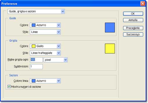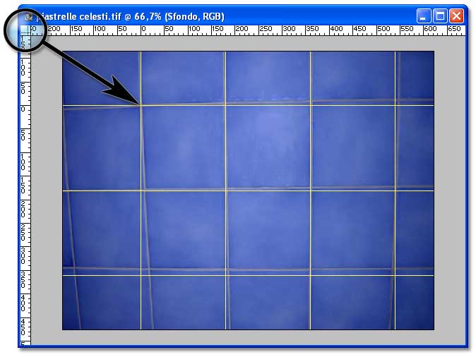 La sua visibilità si imposta con il comando Visualizza/Mostra/Griglia, mentre le sue caratteristiche si stabiliscono per mezzo del dialogo accessibile da Modifica/Preferenze/Guide, griglia e sezioni. Qui può essere utile impostare un valore, per la dimensione della griglia, abbastanza simile alla dimen-sione delle piastrelle; procedo per tentativi, ma l'operazione è resa più semplice dal fatto che le modifiche sono immediatamente visibili sulla finestra di lavoro, senza necessità di chiudere il dialogo. Ancora meglio: posso spostare l'origine direttamente su un angolo delle piastrelle, semplicemente facendo click nell'angolo in alto a sinistra della finestra, e trascinando fino al punto desiderato (devono essere visibili i righelli; se necessario usare il comando Visualizza/Righelli).