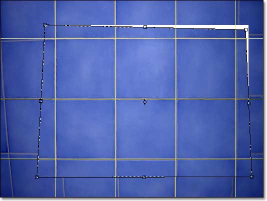 Ora sono pronto. Faccio una selezione rettangolare, un po' più ampia dell'area da elaborare, e scelgo il comando Modifica/Trasformazione libera. Attorno alla selezione compariranno 8 maniglie quadrate, che permettono di manipolarne il contenuto: trascinando una maniglia laterale, si potrà spostare un lato, trascinando una maniglia d'angolo si sposteranno i due lati adiacenti. Se si tiene abbassato il tasto Ctrl ("Mela" sul Macintosh), sarà possibile spostare lati ed angoli senza il vincolo del parallelismo, cioè si avrà una deformazione libera, anziché una semplice traslazione. Cliccando all'esterno dell'area, invece, si potrà ruotare la selezione attorno al punto centrale. Il centro di rotazione è indicato da un contrassegno circolare che è possibile spostare ovunque, anche all'esterno dell'area da trasformare.