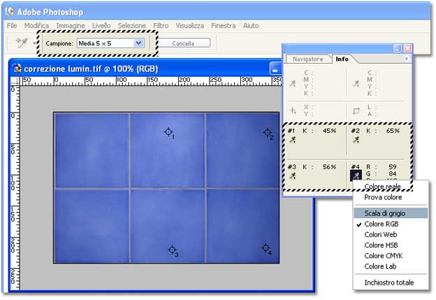 Colloco i punti campione in varie posizioni; per semplicità di lettura, li distribuisco in modo analogo a come compaiono nella palette: il primo in alto a sinistra, il secondo alla sua destra, ecc. Cliccando sul piccolo contagocce, nella palette Info, scelgo la modalità di misura "Scala di grigio", che presumo offra la migliore informazione sulla luminosità. Notate che nella barra in alto, nel menu Campione, ho scelto l'opzione "Media 5x5", perché sarebbe del tutto inutile avere la misurazione effettuata su un singolo pixel arbitrario. Ora, usando gli strumenti Scherma (per aumentare la luminosità) e Brucia (per ridurla), schiarisco o scurisco leggermente le varie aree dell'immagine, finché l'indicazione fornita dai campioni risulta omogenea. È importante usare un pennello molto grande e sfumato, ed applicarlo con passate successive molto "leggere", per evitare segni antiestetici.