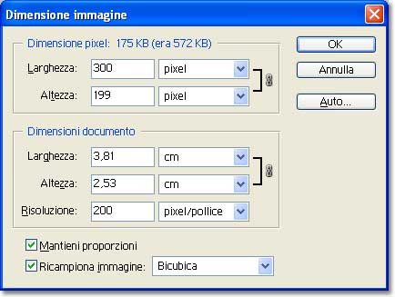 Richiamo il comando Immagine/Dimensione immagine, ed immetto i valori nei due campi superiori. Come si può notare, imponendo 300 pixel di larghezza, ho ottenuto un'altezza di 199 pixel, perché evidentemente la precisione, nel raddrizzamento e nel ritaglio, non è assoluta... se desiderate imporre delle dimensioni precise sia in altezza sia in larghezza, dovrete disattivare la casella Mantieni proporzioni. Il valore della risoluzione, come gli altri del riquadro Dimensioni documento, li possiamo trascurare. L'immagine può finalmente essere registrata in uno dei formati standard gestiti da ArchiCAD (i più indicati sono Tiff e Jpeg).