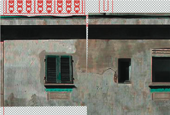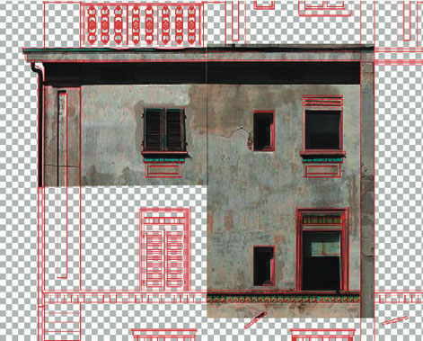 Alla base di tutto c'è, come sempre, il rilievo. E' infatti importante rilevare la posizione esatta delle finestre (e quanti più dettagli sia possibile) in modo da avere dei riferimenti su cui appoggiare le foto da raddrizzare. Una volta disegnato il prospetto a linee 2D con ArchiCAD occorre selezionarle tutte e colorarle, per facilitarne la visualizzazione in Photoshop, di rosso.