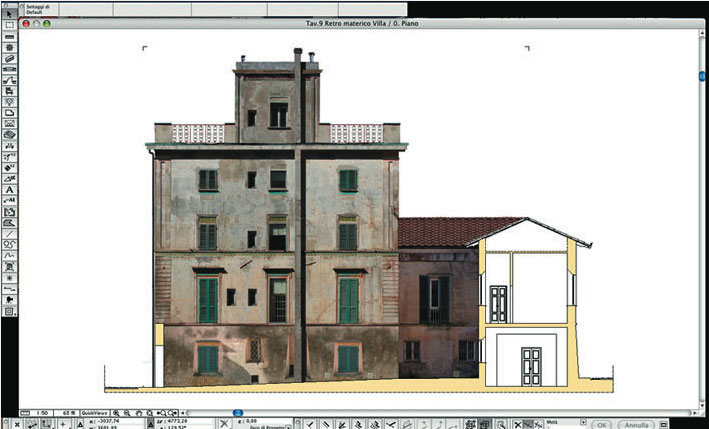 Procediamo così per tutte le foto rimanenti, fino a quando il prospetto non sarà completo. Adesso non rimane che cancellare il Livello Sfondo (quello con le linee guida rosse) e tenerci la foto completa. Salviamo questa foto in BMP, JPG o TIFF (quest'ultimo formato è di qualità superiore) e riapriamo il file in ArchiCAD. Sostituiamo l'immagine alle linee e teniamo solo quelle di sezione. Ecco il risultato finale in ArchiCAD: