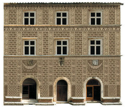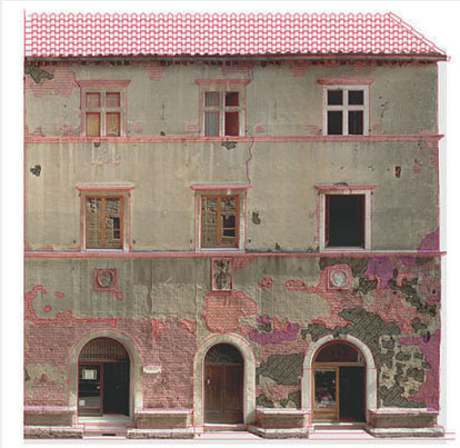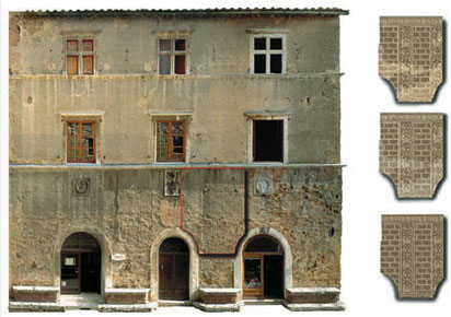 Analogamente si procede per qualsiasi prospetto, anche quelli che all'apparenza possono sembrare complicati. L'importante è non scoraggiarsi subito e dopo un po' di prove otterrete un ottimo risultato. Consiglio di utilizzare questo sistema soprattutto per sottoporre varie ipotesi al committente o alla Soprintendenza, come ad esempio abbiamo fatto per i restauri delle facciate degli edifici di Corso Rossellino a Pienza (SI). Chi conosce la zona, saprà che il corso di Pienza non è largo più di 5 metri, e gli edifici fotografati dal livello strada appaio schiacciati nei piani alti. Anche qui abbiamo riassemblato più di quaranta foto per facciata. La prima immagine mostra il prospetto raddrizzato del palazzo Ammannati con l'indicazione del materico e delle patologie del degrado, la seconda immagine mostra un fotomontaggio con una delle ipotesi di restauro e l'ultima il prospetto con i tasselli delle varie ipotesi di restauro e del trattamento dei graffiti esistenti sotto l'intonaco.
