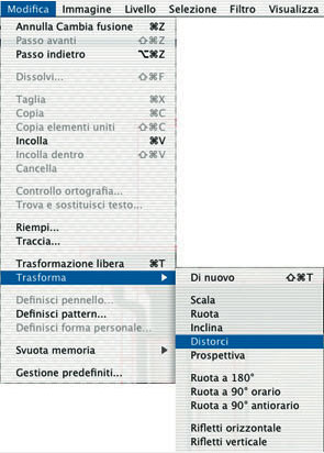 Così facendo l'immagine appena importata verrà mixata con l'immagine di base e otterremo una trasparenza momentanea che ci farà comodo nel momento in cui dovremo adattare la foto al rilievo sullo sfondo. Per adattare l'immagine dovremo usare il comando "Distorci" che si trova nel menu Modifica/Trasforma.