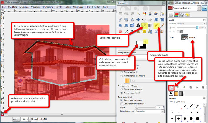 1.1-Con lo strumento matita attivo selezionate colore bianco come attivo (il bianco funziona per rendere trasparente la selezione, il nero per renderla opaca) e ripassare il contorno della casa…