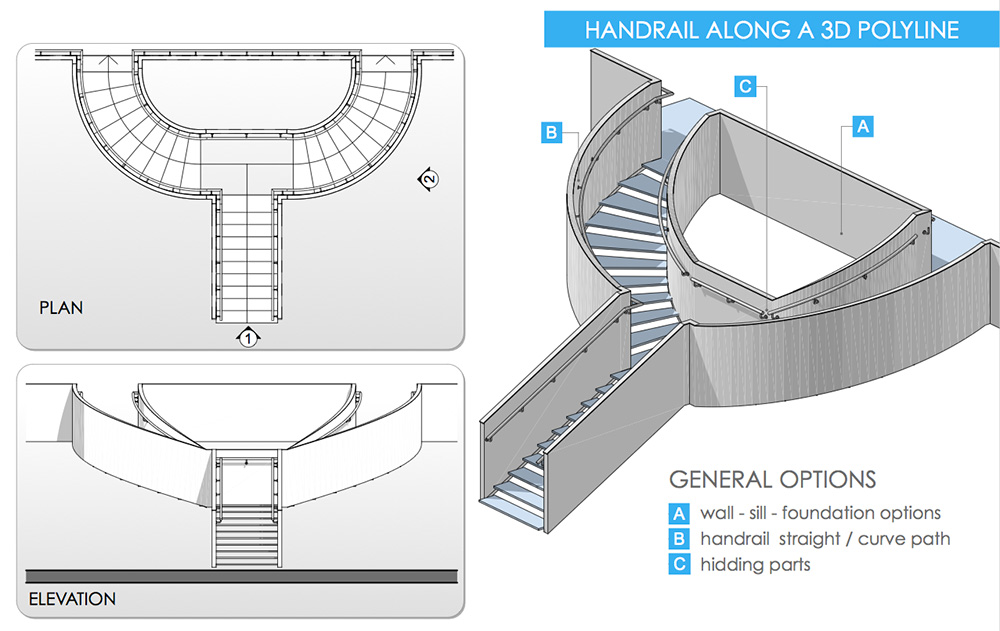 Le ringhiere 3DMD sono strumenti-oggetto per ArchiCAD.Con questi strumenti è facile disegnare una polilinea 3D, sia nella finestra 2D che in quella 3D. È possibile creare sia percorsi curvi che inclinati.Essi hanno molti parametri configurabili: posizionamento, tipo di pannelli, elementi tubolari, montanti, corrimani ecc. Una opzione permetterà di "stirare" a piacere la ringhiera e i pannelli o i montanti verranno posizionati e spartiti automaticamente.
