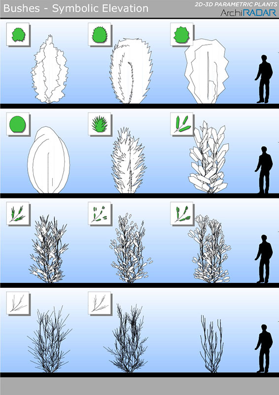 Gli oggetti sono realizzati con un basso numero di poligoni, hanno un fattore di crescita reale in base alla dimensione e inoltre hanno una corrispondente vista simbolica semplificata in prospetto e sezione.