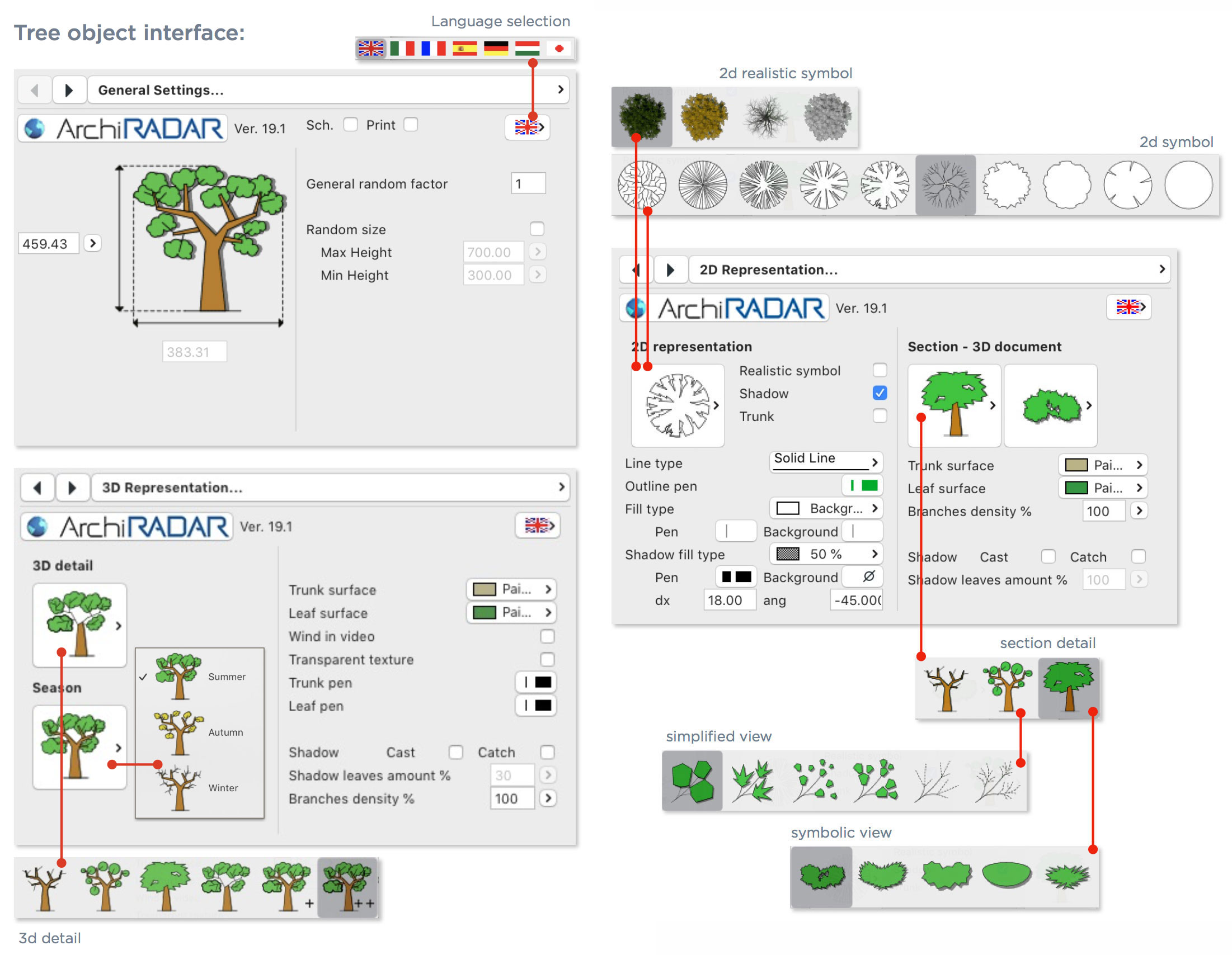 Gli oggetti sono realizzati con un basso numero di poligoni, hanno un fattore di crescita reale in base alla dimensione e inoltre hanno una corrispondente vista simbolica semplificata in prospetto e sezione.