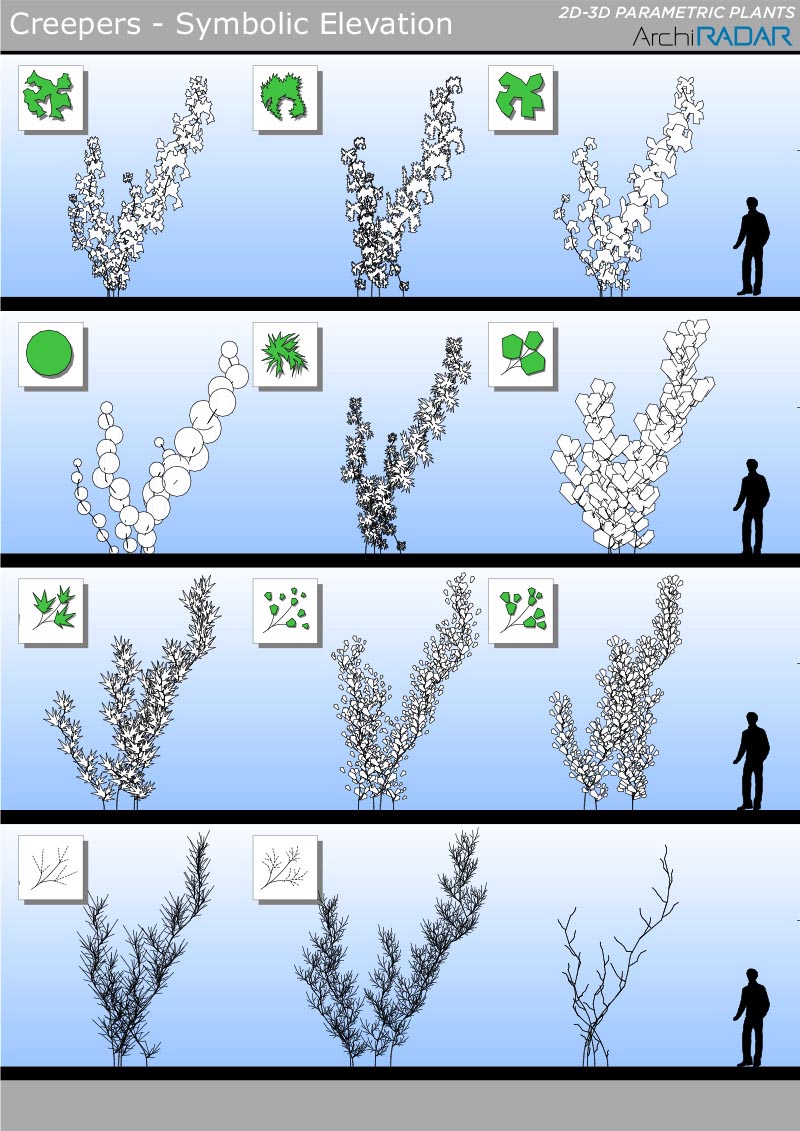 Gli oggetti sono realizzati con un basso numero di poligoni, hanno un fattore di crescita reale in base alla dimensione e inoltre hanno una corrispondente vista simbolica semplificata in prospetto e sezione.