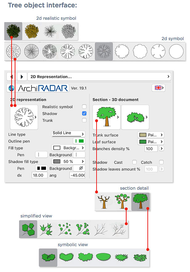 Sono piante sempre diverse l’una dall’altra con possibilità di scegliere fra varie simbologie in prospetto/sezione corrispondenti alla reale geometria della pianta. Simbolo 2D con ombre o realistico. Opzione texture trasparenti.